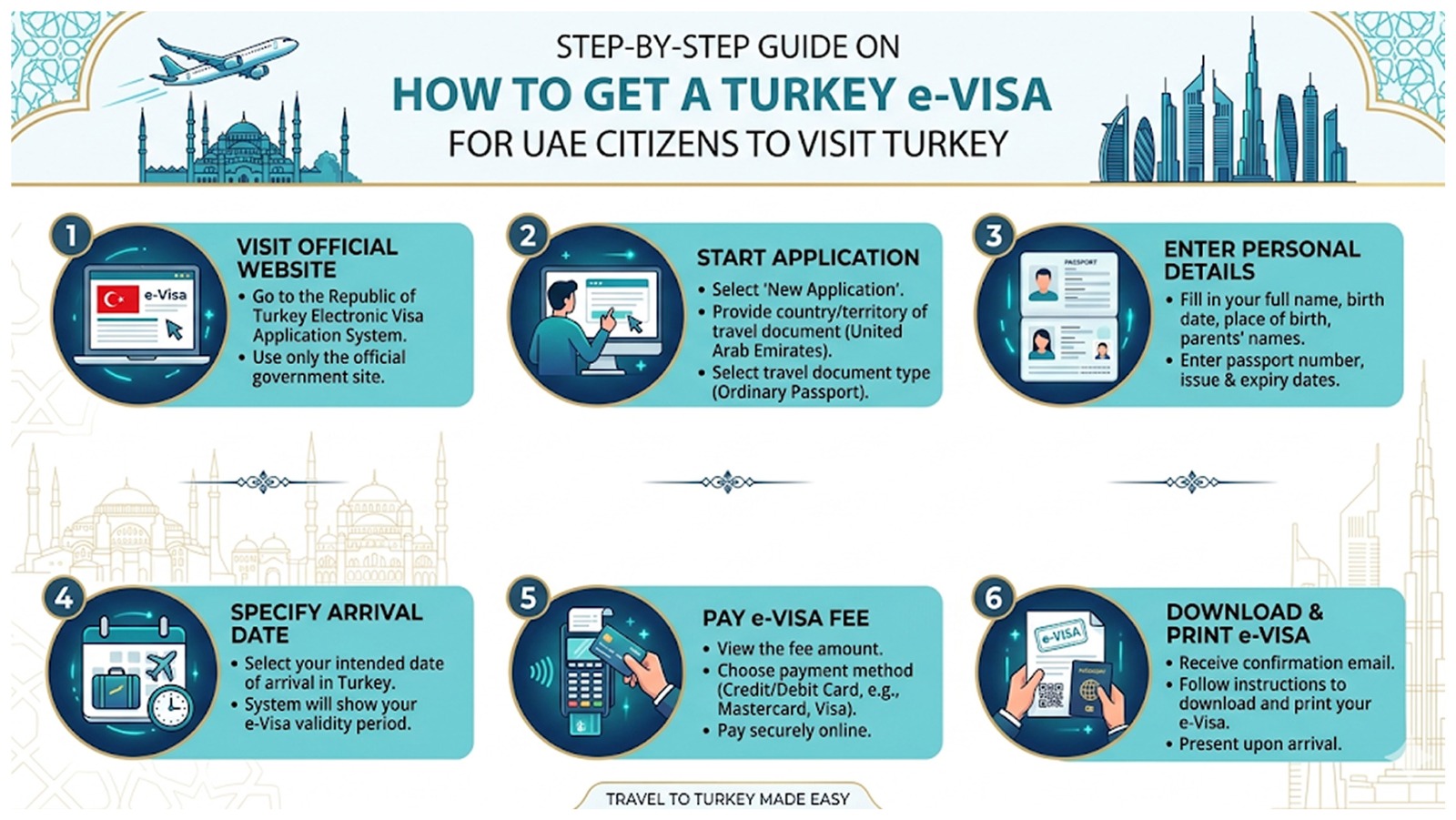 A Turkey e-Visa is the quickest way for qualified travelers from the UAE to travel to Turkey. This is how it can be acquired easily: